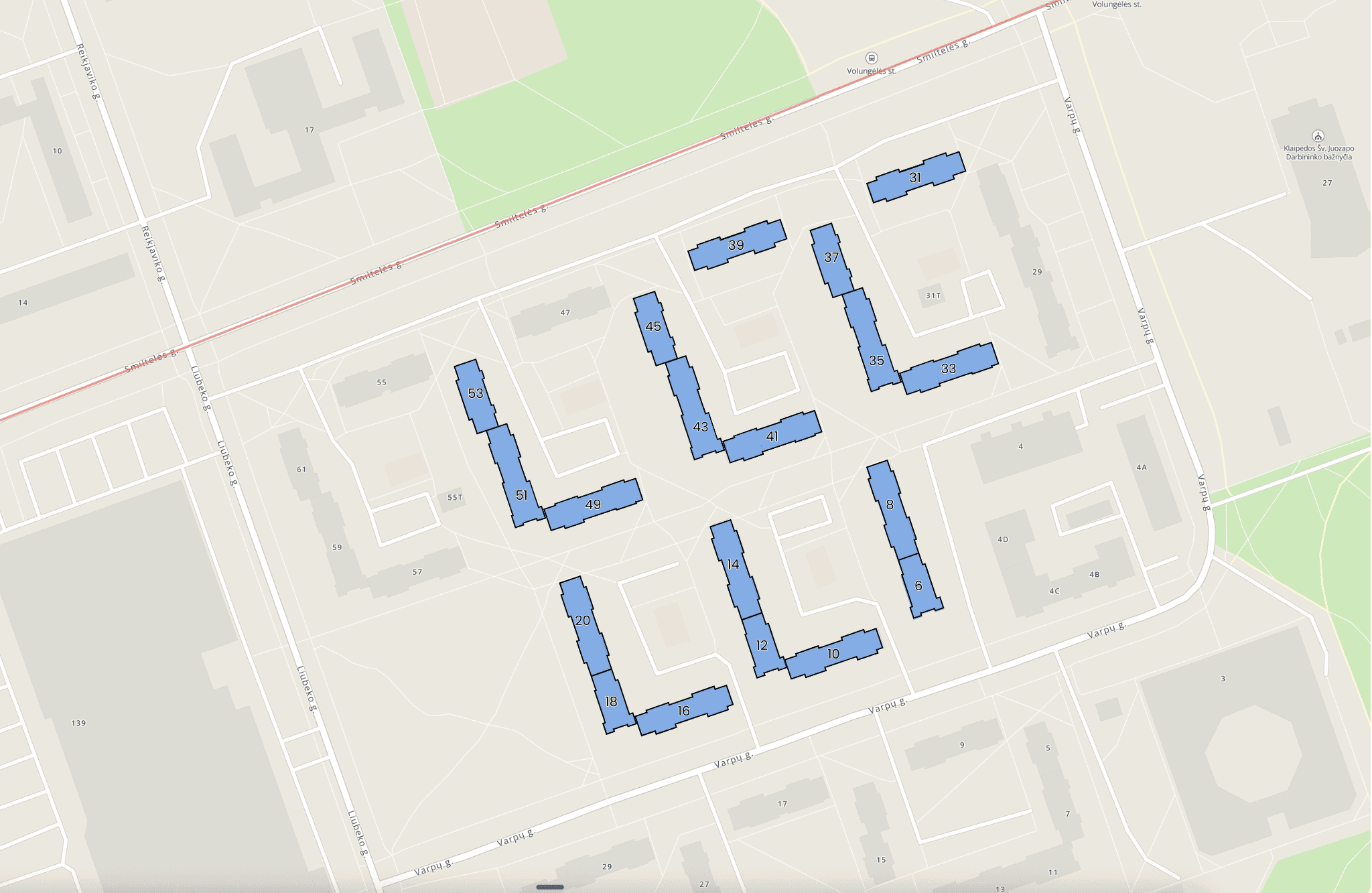 Paveikslelyje pazymeti administruojami pastatai Varpu g. ir Smilteles g.